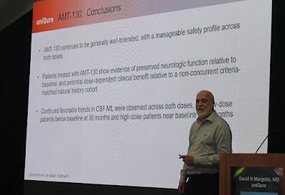 David Margolin, M.D., Ph.D., the vice president for clinical development at uniQure, presented an update on the early-stage (Phase 1/2) clinical trial of the company’s gene therapy drug, AMT-130, involving 39 trial volunteers in the U.S. and Europe. Dr. Margolin reported that, relative to baseline, volunteers treated with AMT-130 showed evidence of preserved neurological function. So far, the drug has proved to be safe.