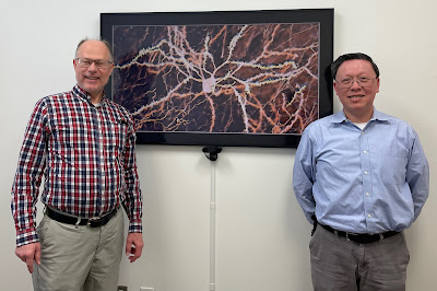 Gene Veritas (left) (aka Kenneth P. Serbin) with Dr. William Yang in his UCLA office. In the background: a mouse medium spiny neuron. In humans this neuron is one of the cells most affected by Huntington’s disease (photo by Nan Wang, Ph.D., of the Yang Research Group).